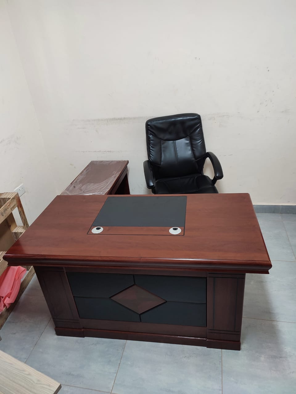 Crafted from high-quality engineered wood with a polished laminate finish, this executive desk combines durability with sophistication. It features a wide worktop for laptops, paperwork, and accessories, plus integrated drawers and a side cabinet for secure storage of documents and office essentials. The central writing pad area adds extra comfort for daily office tasks.